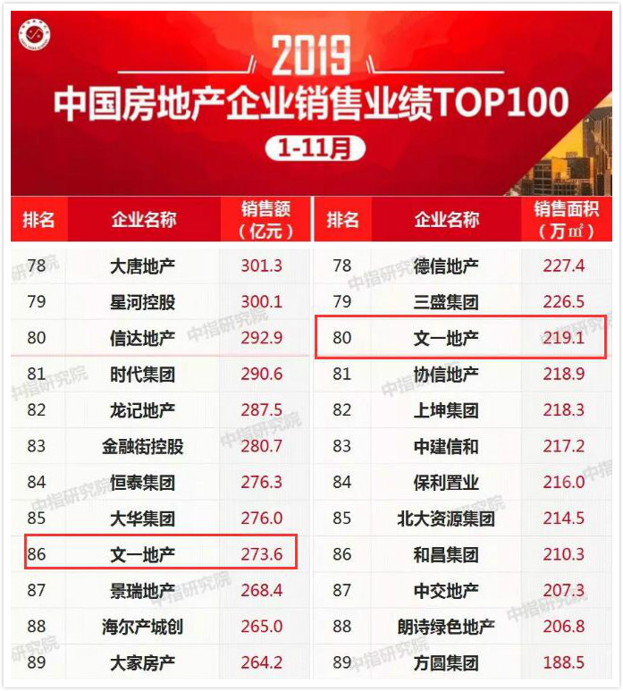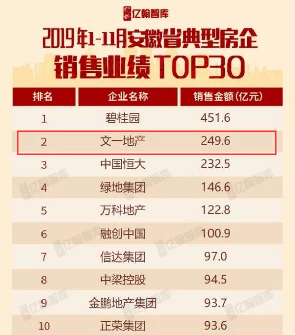 11月31日晚,中国指数研究院权威发布《2019年1-11月中国房地产企业销售业绩TOP100》榜单,文一地产名列销售额排行榜第86位,销售面积排行榜第80位。另据12月1日亿翰智库发布的《2019年1-11月安徽省典型房企销售业绩TOP30》显示,文一地产荣登榜单排名第二,居安徽本土房企首位。