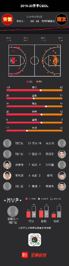 全场比赛,安徽文一11人上场均有得分,刘仁斌得到全队最高的23分和11个篮板,王耀锋15分,杨越14分,孙伟博贡献10分。