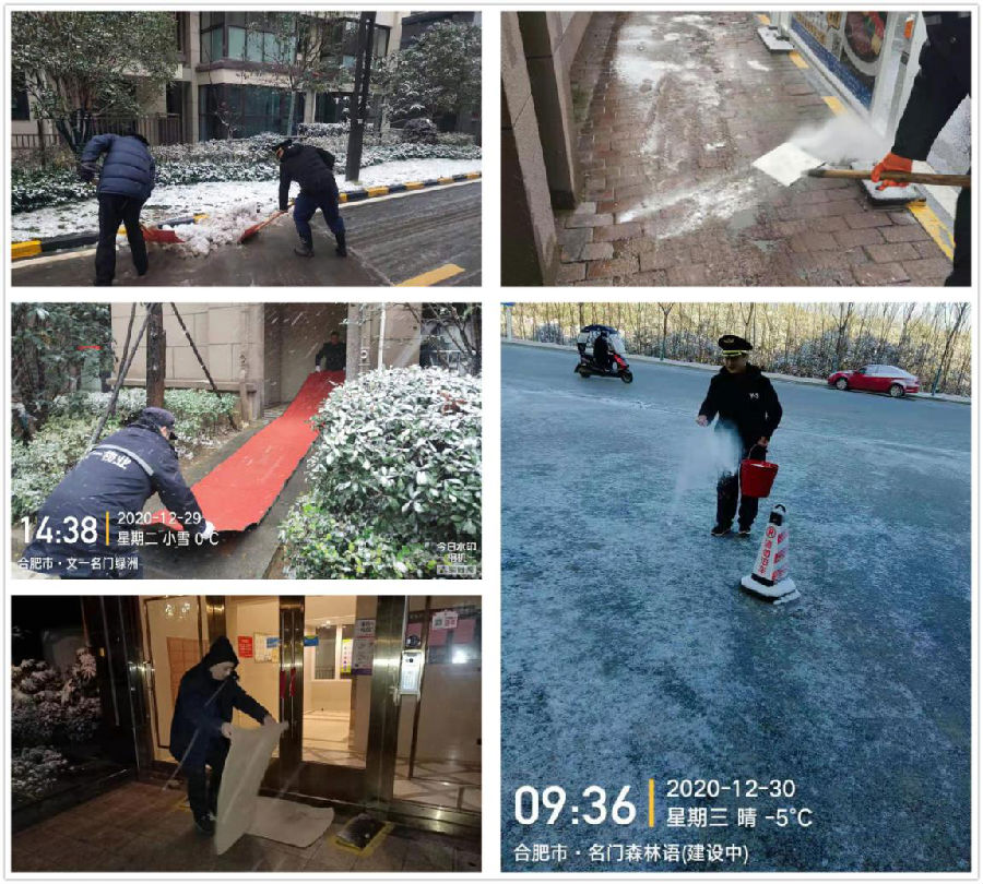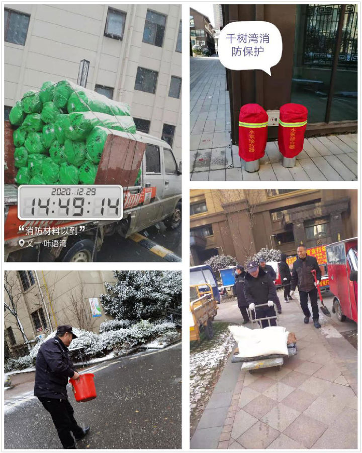 高度重视,提前部署。在文一滨江物业管辖社区内,针对极端天气,均设置有应急预案。25日一早,公司组织各项目召开“防寒防冻部署工作会议”。会后立即成立“防冻应急小组”及部署各项防冻处置预案,提前储备除雪设备、材料和物资。29日暴雪寒潮来袭,第一时间紧急启动应急预案,各岗位人员在降雪前全部进入值班待命状态。降雪后,一线人员连夜开展除雪防滑作业。