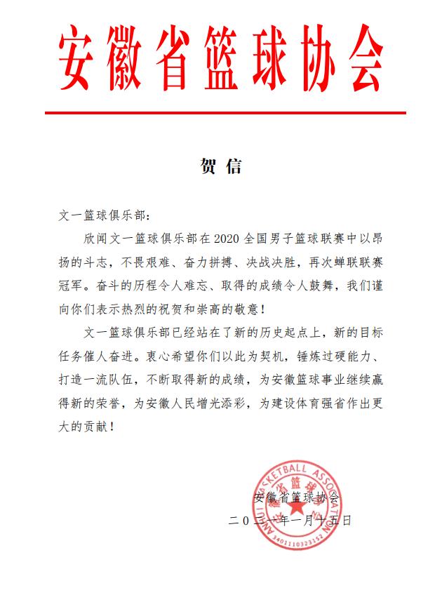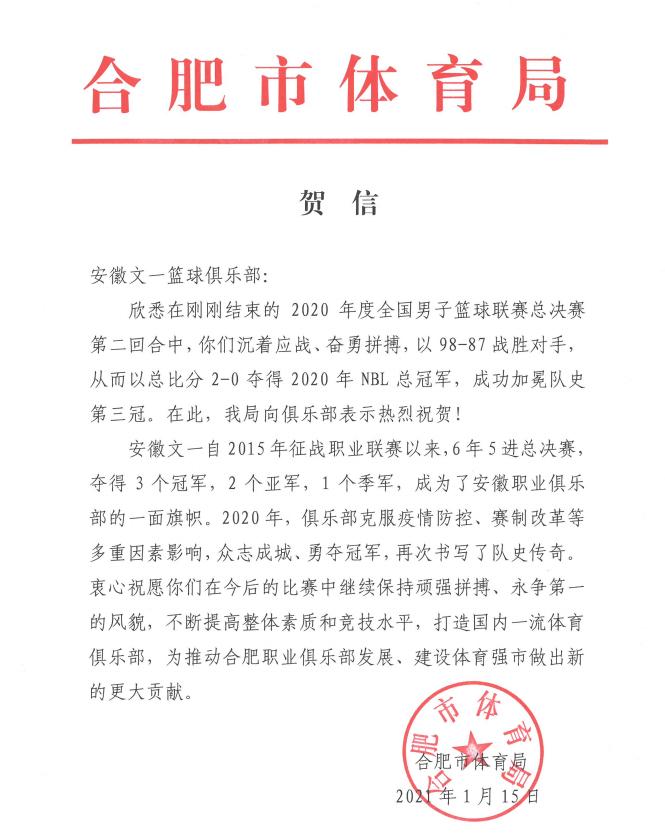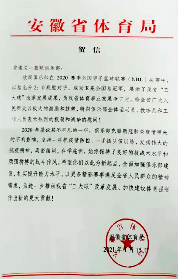 1月14日晚,2020赛季NBL总决赛第2场,文一篮球俱乐部手握冠军点迎战广西威壮队,以2:0的大比分夺取赛季总冠军,成功实现卫冕。为肯定成绩,表彰荣誉,1月15日晚,文一集团举办文一篮球俱乐部2020 NBL联赛总冠军嘉奖会。安徽省体育局、省篮球协会和市体育局第一时间发来贺信,对文一篮球俱乐部取得的巨大成就表示肯定和祝贺,并对俱乐部未来发展寄寓深切希望。