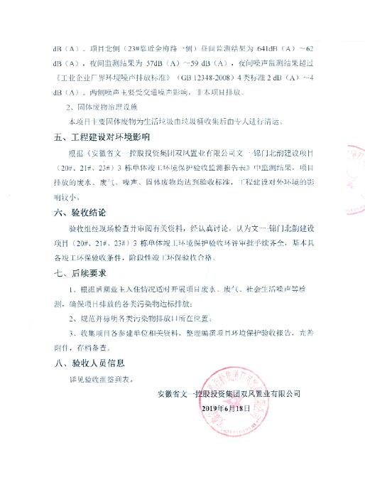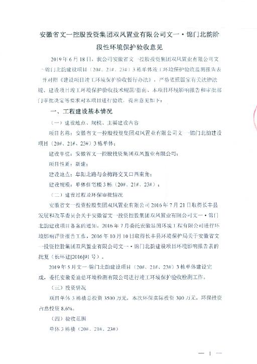 安徽省文一投资控股集团双凤置业有限公司文一·锦门北韵阶段性环境保护验收意见