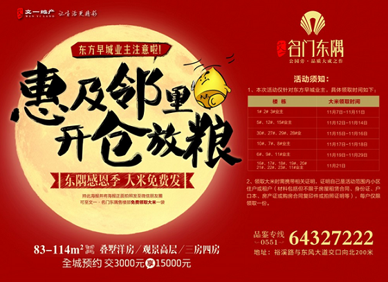 开仓放粮的义举古来有之,而今,文一·名门东隅也将效仿古人,惠及邻里,开仓放粮!东隅感恩季,大米免费发,2015年11月7日-11月21日,东方早城住户持活动海报及朋友圈转发凭证,前往文一·名门东隅售楼处领取价值50元东北优质大米一袋,1、领取大米的东方早城住户需关注“文一名门东隅”项目微信公众号并将活动海报正面拍照转发至朋友圈;2、住户领取礼品时需携带相关证明(房屋租赁合同、身份证、房产证或购房合同复印件或拍照证明等),证明自己是活动范围内小区住户或租户,一户仅限领取一份。
