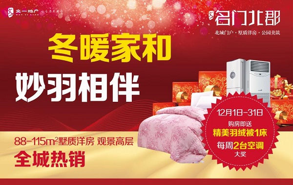 即日起至12月31日,认购名门北郡任意房源即可获得精美暖被一床;此外购房客户还可参与每周末现场抽奖,每周两台精美品牌空调送不停!