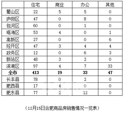 据备案数据统计,2015年12月15日(星期二)合肥市区备案住宅类商品房413套,备案商业19套,备案办公33套,备案其他类商品房47套。其中,楼盘方面,住宅类商品房销售套数最多的为庐阳区文一·名门湖畔,单日销售36套,居单日销量榜首。此外,瑶海区文一·名门皇马单日销售19套,肥东县文一·名门河畔单日销售18套。