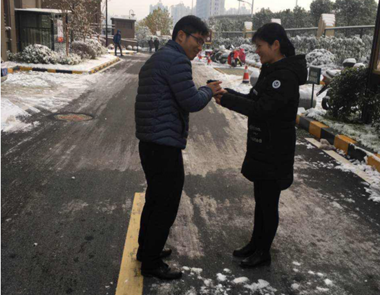 寒潮来袭,合肥温度陡然下降,紧接着便是一场鹅毛大雪,雪后的世界一片素净,在外行走的人们都不约而同地抱紧双臂,以抵挡冬日凛冽的寒风。在这寒冬之际,恰逢感恩节之时,11月24日,文一·名门首府物业团队开展了一次感恩业主送姜茶活动。