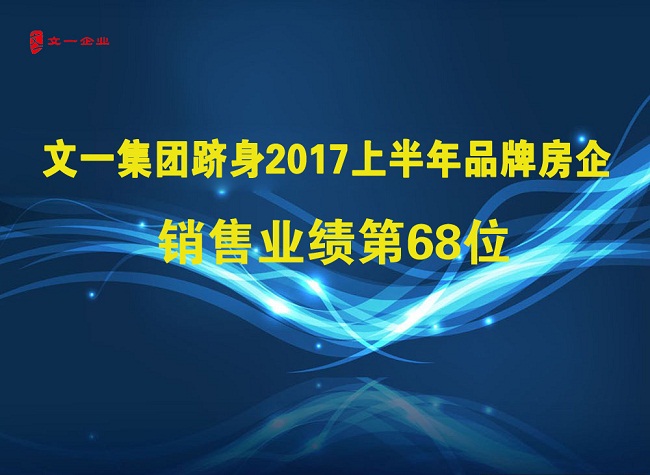 6月30日晚,中国指数研究院权威发布《2017上半年品牌房企销售业绩排行榜》。根据榜单显示,文一集团以131亿元销售额、122万方销售面积跻身榜单第68位。
