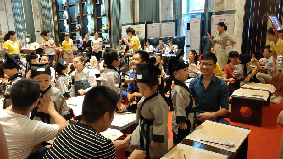 下午2点30,活动还未开始,金色摇篮幼儿园的老师和学童们便来到文一·塘溪津门营销中心,在现场工作人员的引导下有序签到。下午3点左右,现场所有学童更换汉服。作为汉民族传统服饰,汉服是中国“衣冠上国”、“礼仪之邦”、“锦绣中华”的集中体现,承载了中华织染绣等杰出工艺和美学。小学童们穿上汉服翩翩落座,一派儒雅风范。