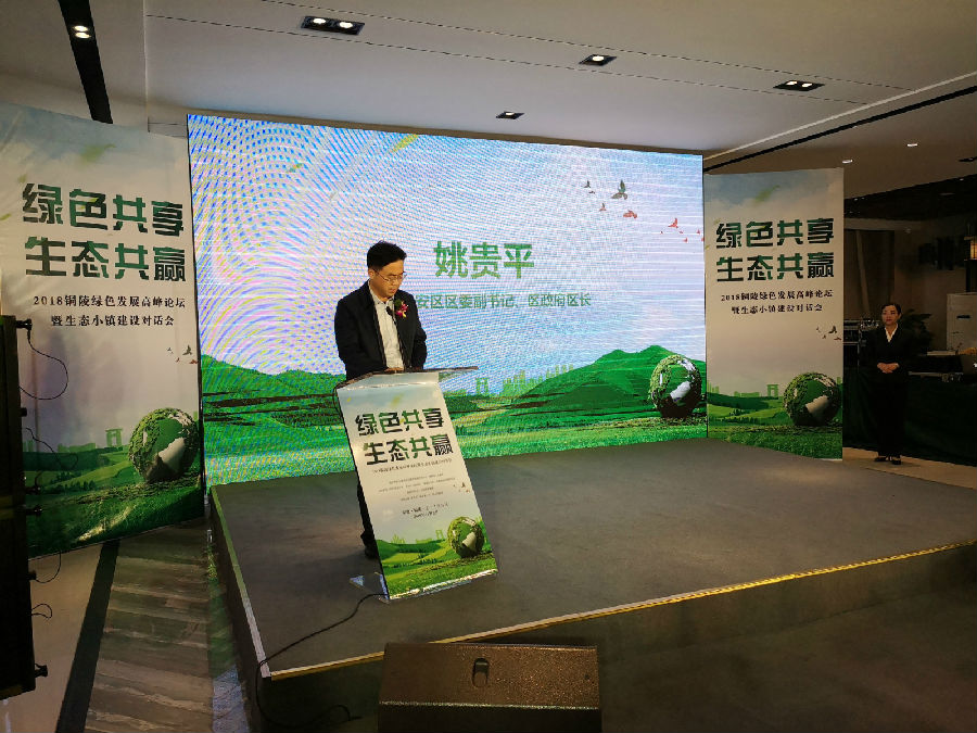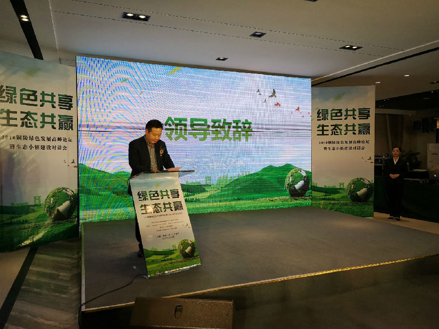 铜陵市政府副秘书长袁和明在论坛上发表致辞,他说道:铜陵是八百里皖江上一座重要的节点城市,也是闻名全国的“古铜都”,历史文化底蕴深厚,生态环境优势明显。十八大以来,铜陵市以“绿水青山就是金山银山”的理念为指导,持续推进产业转型、城市转型,打造资源节约、环境友好的产业样板,着力建设绿色美好家园,走出了一条经济增长与碧水蓝天相伴的新道路,连续3年获得资源型城市转型绩效考核优秀的奖励。铜陵市秉承生态新理念,建设绿色山水人铜都,努力建设安徽生态文明的新高地。