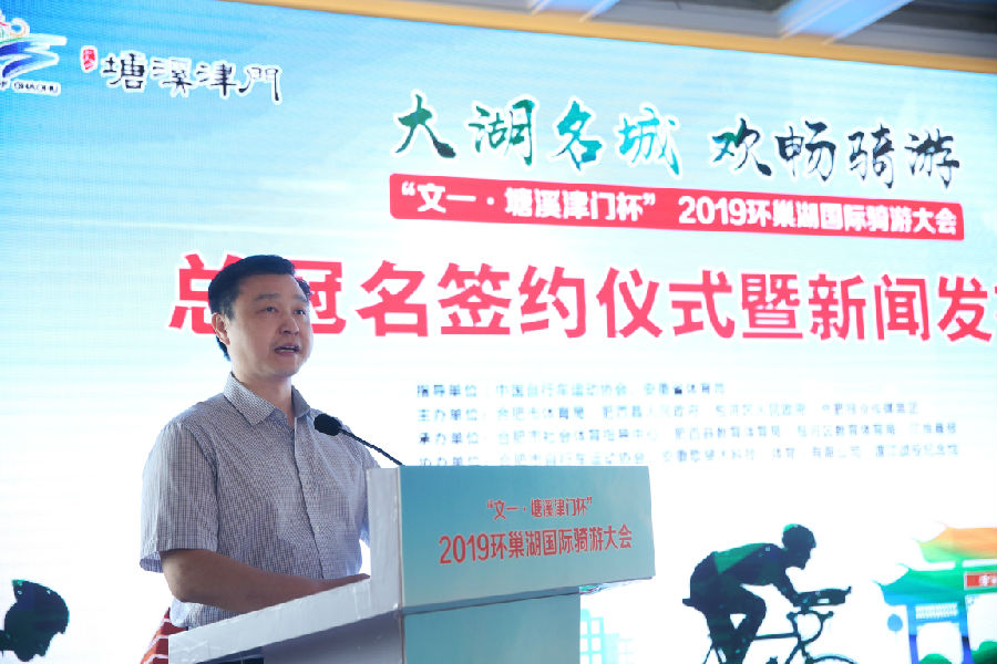 文一房地产集团执行总裁兼滨江置业总经理夏明军在致辞中表示,本届环巢湖骑游大会是合肥市承办的又一高规格高水平体育活动,也是一场健康绿色的体育盛会。文一十分荣幸能够参与本届骑游大会,为环巢湖国家旅游休闲事业贡献自己的一份力量,而文一·塘溪津门拥有得天独厚的区位地理条件,兼具秀美风光与人文底蕴,未来将打造成为一个不负于历史、不负于城市的建筑场所,必将成为“滨湖旅游新亮点、合肥文化新名片、安徽文化新核心”,衷心预祝“文一·塘溪津门杯”2019环巢湖国际骑游大会圆满举办。