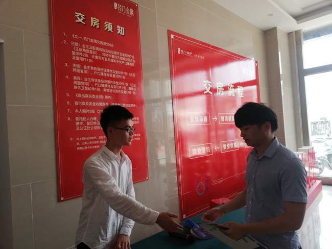 服务周到,讲求效率,文一·名门金隅项目在交房区入口张贴交房流程及交房须知,每一个流程都贴心安排了专门的服务人员。从签到排队等候、资料审核、办证登记、财务收费、礼品领取、物业收费、物业签约、验房到办理钥匙签收,专业人员指引答疑,所有环节井然有序。
