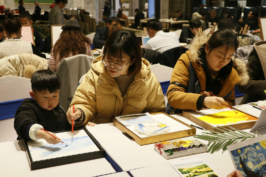“画”别喧嚣,新岁共赏,当拿起画笔的那一刻,端起五彩缤纷的调色盘,所有艺术细胞皆被调动,每个人都化身为艺术家。活动当天,室外呵气成霜的清冷,与塘溪津门暖心现场形成鲜明对比,色彩与心灵的碰撞、梦幻的艺术油画之旅即刻启程。