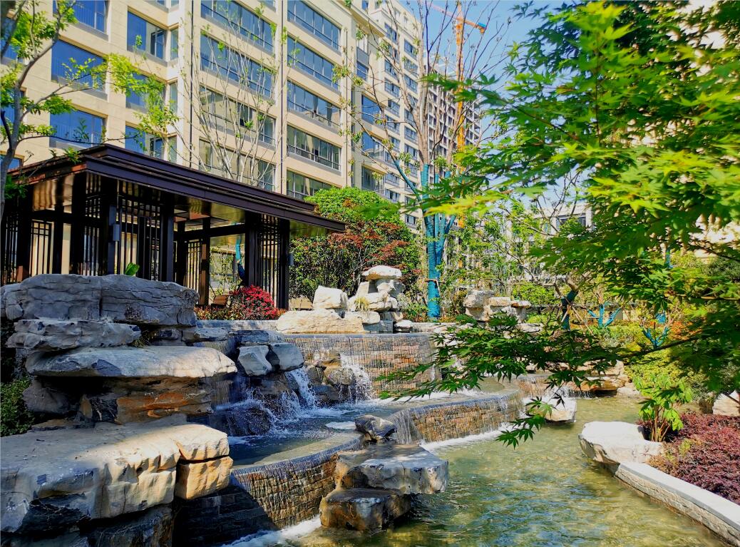 丹青之美,美在水之活韵、林之藏深、石之叠境。丹青园入口便是引水入园绘就一幅荷塘月色景观,是园区景观中的点睛之笔, 正所谓“有山皆是园,无水不成景”。筑池蓄水,以水面为镜,倒影为图,作影射景;可赤鱼戏水,水生植物飘香满地;池内筑山、设瀑布及喷泉等各种不同意境的水式,使人浮想联翩,心旷神怡。林木花草之间,让归家的业主徜徉之中,浸透着烂漫的色彩和逸悦的情怀,春荣、夏茂、秋藏、冬韵极力寻求自然与生活空间相呼应的新中式园林,是栖居城芯的“心灵后花园”。