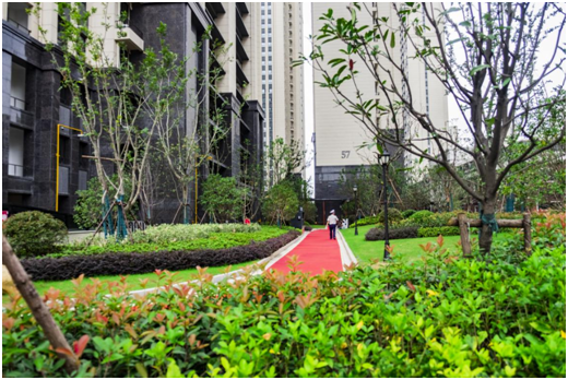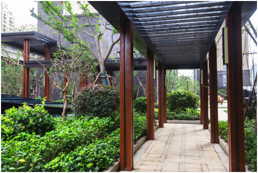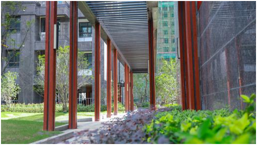 同时,架空层的设计也为居者构筑起了“避风港”,使居住者在风霜雨雪天气下皆可闲庭信步,邻里社交,喝茶聊天,于不同视角观赏社区园林景观。