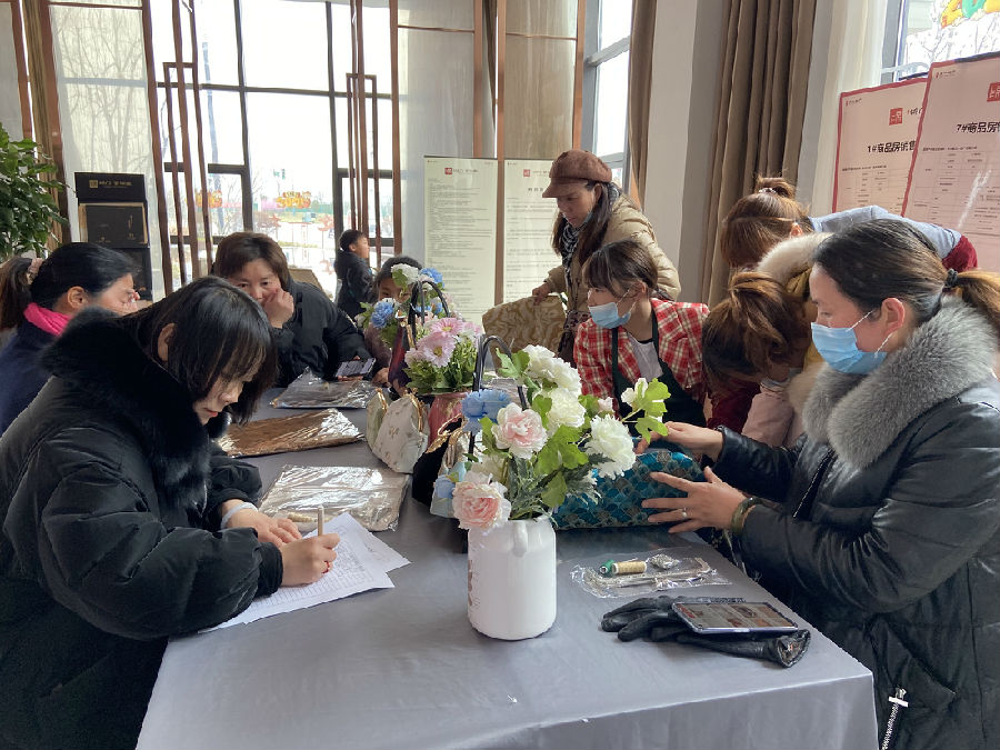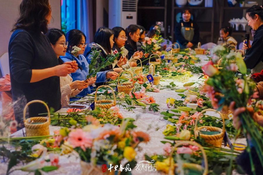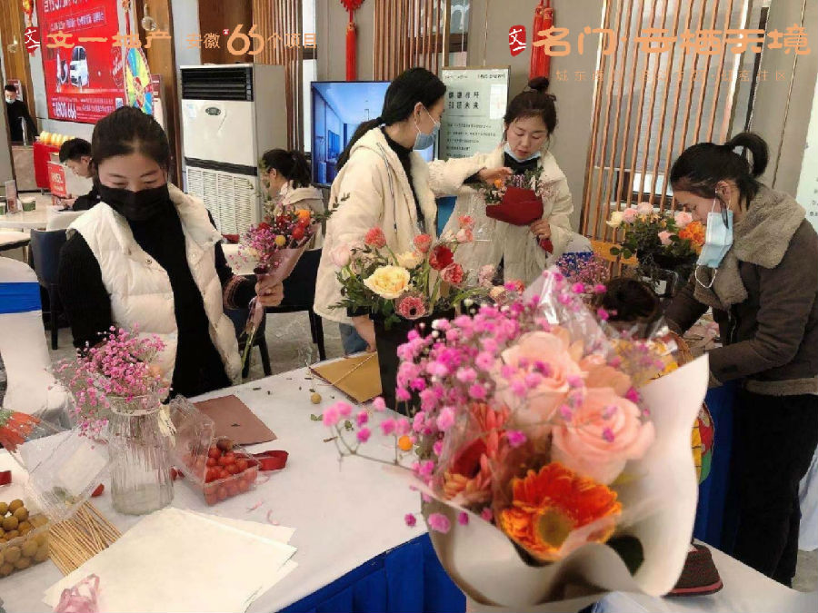 营销中心内花团锦簇,气氛热烈。女神们一展心灵手巧,一幅幅插花作品在手中展现,让爱意在指尖传递,让幸福在花香里流淌。