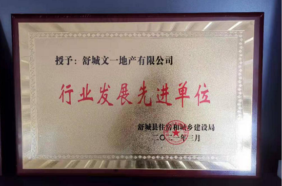 近日,为表彰优秀、鼓励先进,发挥房地产行业优秀企业在行业发展中的示范、带头和标杆作用,舒城县住房和城乡建设局表彰行业先进企业。舒城文一地产有限公司荣获“行业发展先进单位”荣誉称号。