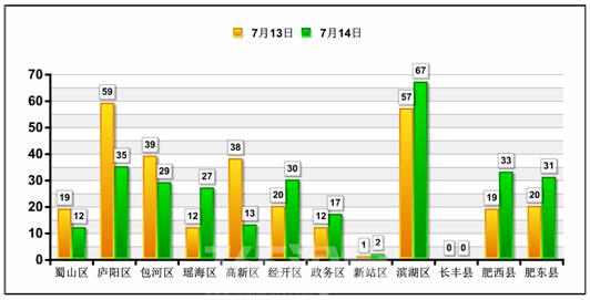 楼盘方面,7月14日合肥住宅类商品房销售套数最多的八家楼盘中文一名门南郡22套、文一名门学府18套、文一名门河畔15套、文一名门华府10套。