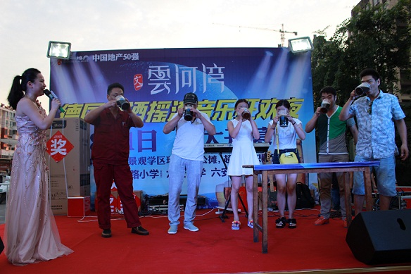 下午6点30分,活动在乐队激情的表演中正式拉开帷幕。随后,劲爆的喝啤酒比赛在欢呼声中开启,每轮比赛需6人参加,每人面前有相同分量的啤酒,在最短时间喝完的人便会获胜。喝啤酒对于男人而言,可以说是天性,但是现场的女性同样不可小觑,一位大姐更是在与几位男选手的竞争中大幅领先,现场掌声不断。