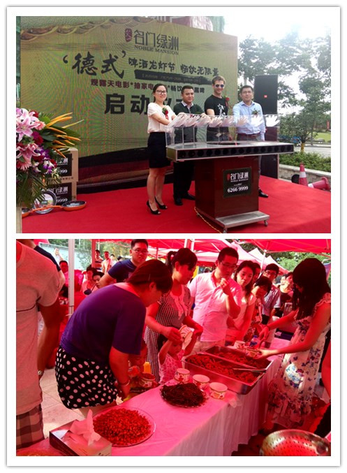 吃龙虾不用去宁国路,喝德国啤酒不用去慕尼黑。文一·名门绿洲德式黑啤龙虾节让你一次high个够!7月25日下午,让人期许已久的文一·名门绿洲美食季正式启动。文一房地产集团副总裁邱胜华先生莅临活动现场并致辞,同时还邀请来了文一地产肥西置业副总经理杨平女士、合肥双锁销售公司副总经理何森彬先生和来自美国的凯文先生共聚一堂。随着领导们共同按下启动器的那一刻,美食季的活动拉开了大幕!参与活动的业主们在尽情品尝五星级戴斯大饭店烹制的龙虾和纯正德国黑啤的同时,更有机会参与家电大抽奖,当然还可以边吃边看精彩电影大片,现场气氛火爆、业主好评不断!