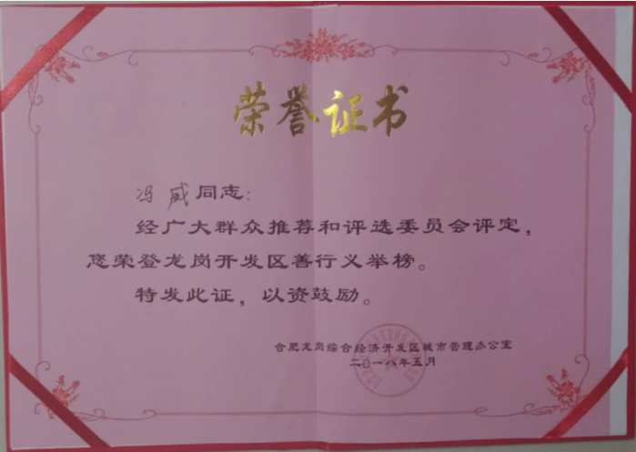 冯威2010年7月加入中国共产党,2011年12月进入文一一品宴和平大酒店从事行政企划工作。7年来,冯威利用业余时间积极参加捐款、慰问、救灾、帮扶、敬老、扶残等爱心活动百余次。尤其从2014年起,不定期参加献血活动达4次;2016年7月参加肥东长临河镇抗洪救灾中,不畏艰险,与其他广大志愿者们为灾区百姓搬运救灾物资,手臂多处受伤;2018年4月组织志愿者进行捐款并赶往安医一附院血液科看望白血病患者......类似爱心活动不胜枚举。