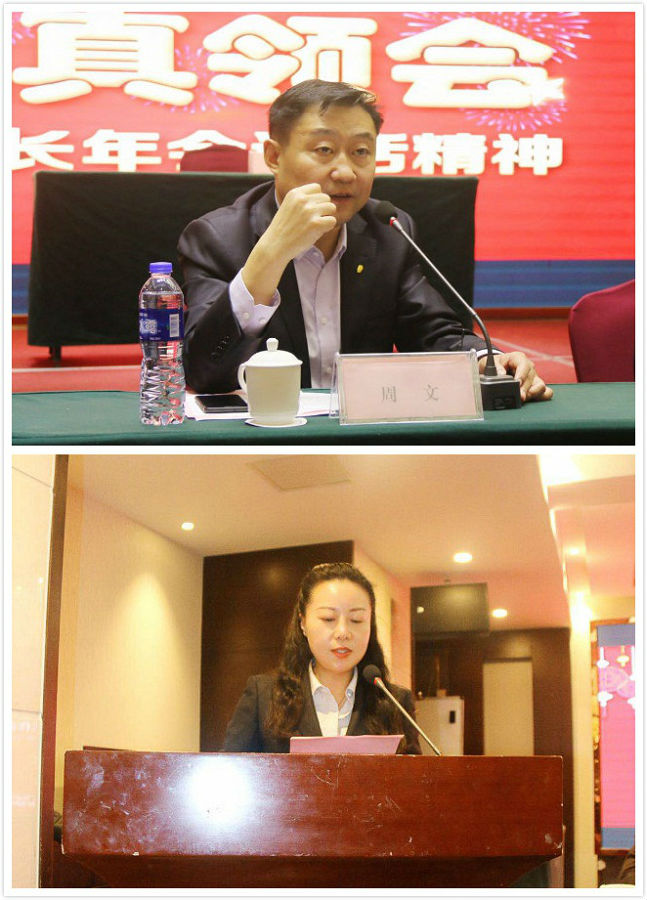 (上图:文一集团副董事长周文讲话;下图:文一物业总经理赵虹作年度工作报告)