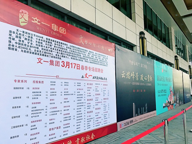 在本次招聘会上,文一旗下地产、建工、餐饮、文旅、物流、物业、教育、酒业、传媒、体育、矿业等多个产业纷纷招贤纳士,招聘的主要岗位有地产现场类、行政综合类、招标成本审计类、财务管理类、地产营销类、物业物流类等共计百余个优质岗位。本次面试继续采用基层岗位与中高级人才分离面试的形式,提高面试效率。从早上8点半开始,面试持续到下午2点钟结束,共有200多名优秀人才通过初试,他们将参加3月25日的复试。