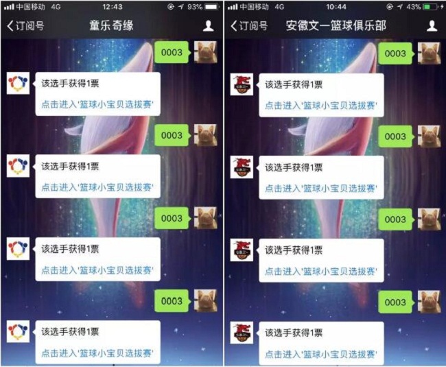 投票方式:请在“文一篮球俱乐部”(ID:ahwenyiclub)/ “童乐奇缘”(ID:tongleqiyuan)任一微信公众号平台回复选手编号,例如:0035,即可给选手投票,每人每天每公众号平台可投5票,两个公众号平台每天共可投10票。