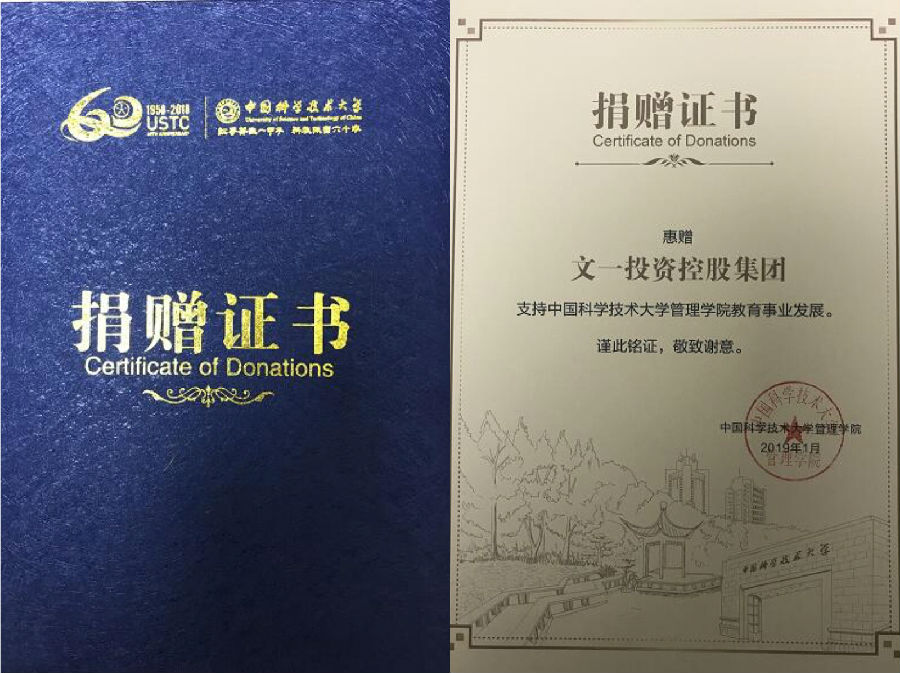 在活动颁奖环节,文一集团作为支持中国科技大学管理学院教育事业发展的企业之一荣获捐赠证书。由中科大副校长陈晓剑、管理学院执行院长余玉刚分别为获奖企业颁奖。