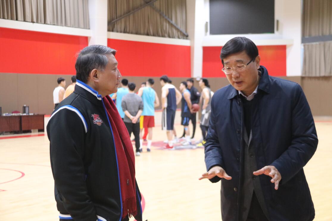 座谈会后,陈海军一行先后来到文一男篮体能训练室和训练基地,现场观看了文一青年队的体能训练和成年队的技战术训练。宫鲁鸣详细介绍了球队当前一段时期的训练计划和安排,陈海军在观看训练的时候就文一男篮职业化建设与软硬件设施和宫鲁鸣进行了深入交流,同时还勉励文一男篮运动员们刻苦训练,在比赛中奋勇拼搏,再创佳绩。