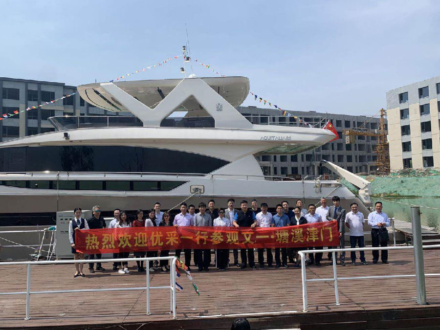随后,嘉宾一行来到津门1号游艇前合影留念,登高远眺,项目建设如火如荼,雏形已现。有嘉宾表示,文一·塘溪津门在文化旅游产品的构筑与当代人文生活的融合方面确有过人之处,堪称业界典范,值得推广和借鉴。