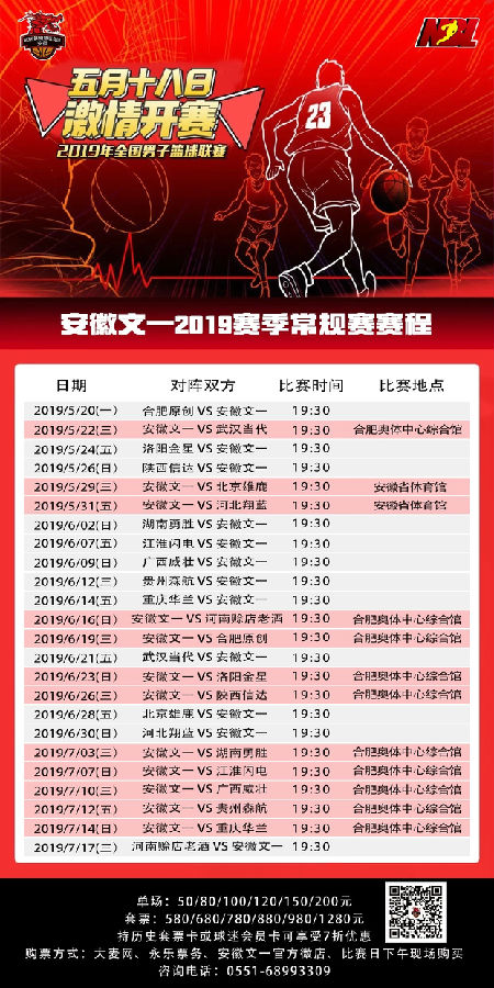 5月20日,安徽文一将客场挑战远走佛山的合肥原创。5月22日晚,安徽文一将坐镇新主场合肥奥体中心综合馆,迎战武汉当代。为了更加方便广大球迷购票,安徽文一近日已经启动现场售票工作,广大球迷朋友可前往奥体中心现场购票。与此同时,文一男篮和安徽交通广播《体育圈》、安徽新闻综合广播《新闻晚高峰》、安徽城市之声《心花一路放》、安徽旅游广播《开心副驾驶》、合肥交通广播《体坛60码》以及合肥故事广播《在路上》六大电台节目展开合作,球迷朋友收听节目参与互动时也有望获得安徽文一男篮主场揭幕战球票。