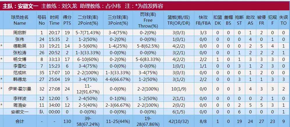 全场比赛,除了罗切斯特外,进入大名单的其余11名球员全部得分,其中7人得分上双,霍尔曼砍下24分和10个篮板,三节便打卡下班,韩德龙和周启新分别贡献19分,杨文博17分,德勒黑14分,蒋淯安和范成林分别贡献12分和10分。