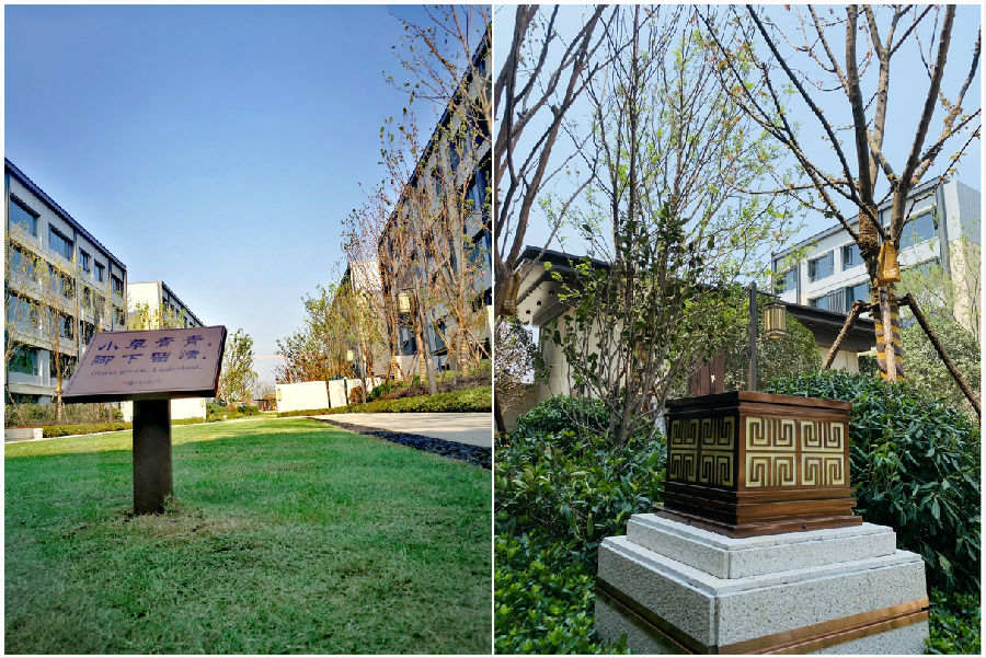 远处可见树丛中的建筑,营造了一种藏而不露、视野延绵不断的意境图画;为了园林意境的最大化发挥,除了对徽山皖水理念的营造,塘溪津门还结合了实际的地质资源的特征和差异化亮点,仿技“枯山水”式营园手法,流线型充满纹理的园路象征“潺潺水流”、满花池鹅暖石禅意并蓄。