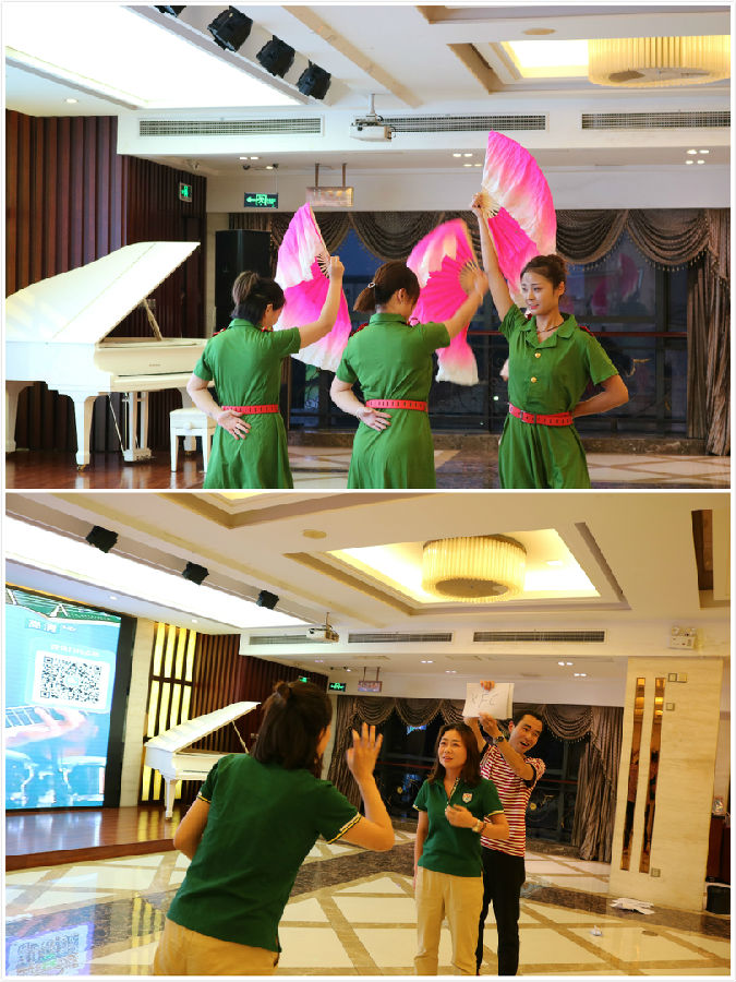 晚宴中,园长、老师们纷纷登台展现一个又一个即兴发挥的精彩节目,将整个活动晚宴推向高潮。其中,经典又不失创意的团队游戏,让大家充分愉悦身心的同时大大增强了团队凝聚力。现场欢笑声,加油声,呐喊声,此起彼伏,不绝于耳。