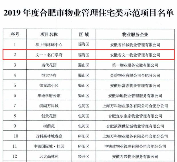 4月30日,合肥市住房保障和房产管理局发布《关于表彰2019年度合肥市物业管理示范项目的通报》,公布了2019年度合肥市物业管理住宅类示范项目名单,全市共19家小区入选,文一物业管理的文一·名门学府项目成功荣获“2019年度合肥市优秀示范小区”称号,成为瑶海区仅有的两家入选小区之一。