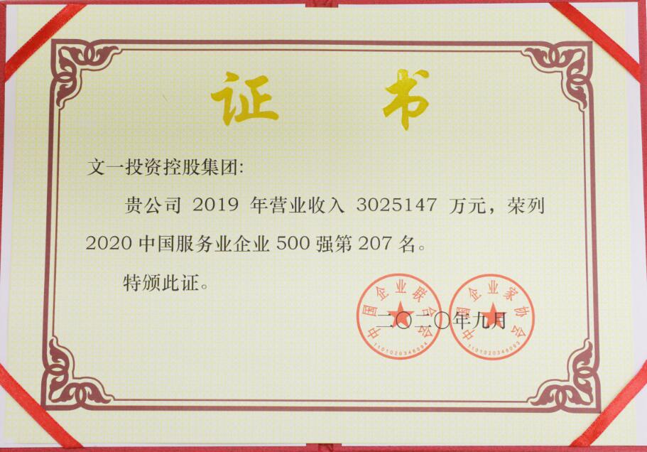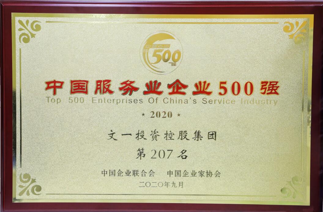 9月27-28日,2020中国500强企业高峰论坛在河南郑州召开。会上发布了2020中国企业500强、中国制造业企业500强、中国服务业企业500强、中国100大跨国公司榜单,文一投资控股集团荣登2020中国服务业企业500强榜单第207位。