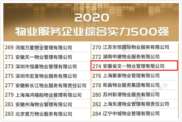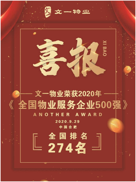 9月29日,中物研协和上海易居房地产研究院中国房地产测评中心联合开展的“2020物业服务企业综合实力和品牌价值测评成果发布会”在郑州举行。会上隆重发布2020物业服务企业综合实力500强榜单、各细分业态及各领域领先物业服务企业榜单,文一物业荣登2020物业服务企业综合实力500强榜单第274位,系连续两年获此殊荣。