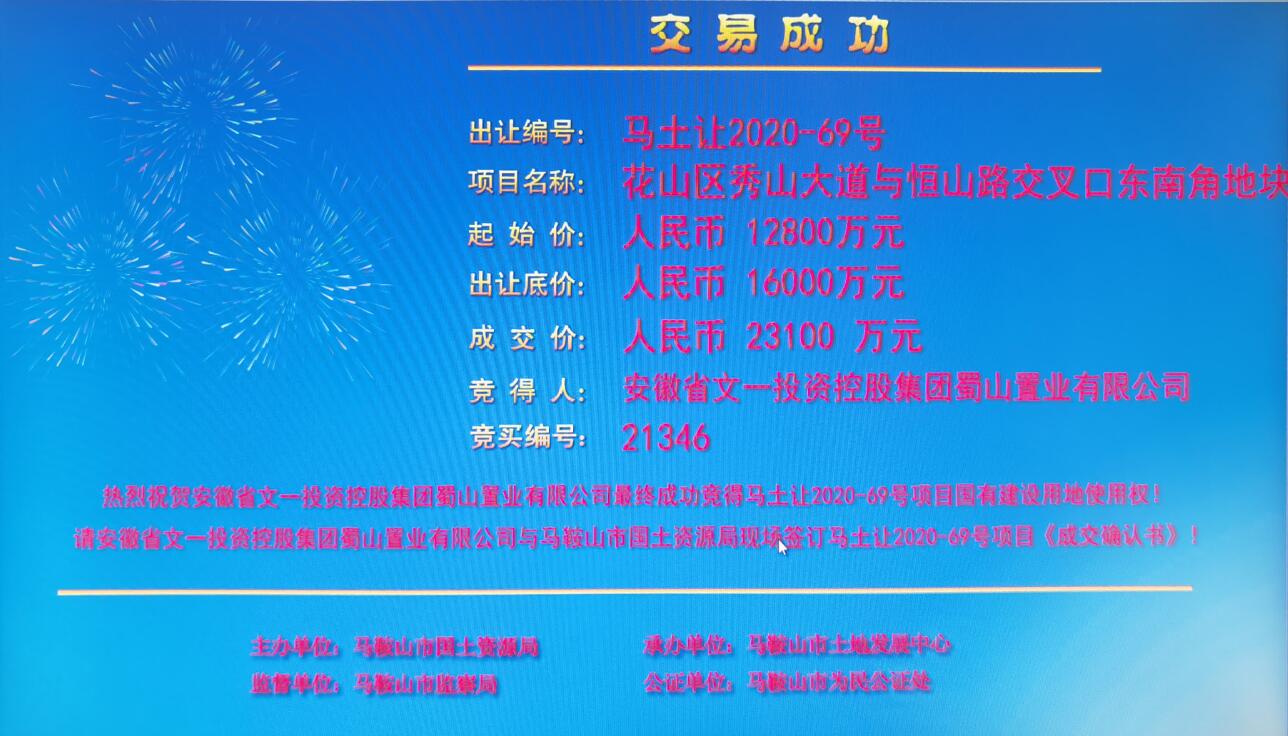 11月26日,文一地产以总价2.31亿元成功竞得马鞍山2020-69号宗地,总用地面积32亩,单价721.9万元/亩。