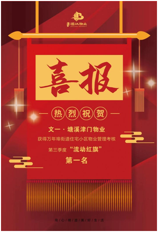 12月8日,文一滨江物业所辖文一·塘溪津门物业获得2020年云华社区万年埠街道第三季度流动红旗评比第一名,并现场接受万年埠街道领导颁发的“流动红旗”。获得“流动红旗”荣誉是上级主管部门和广大业主们对物业工作的肯定,也是对文一滨江物业提升小区环境、服务质量,营造文明氛围等工作的认可。