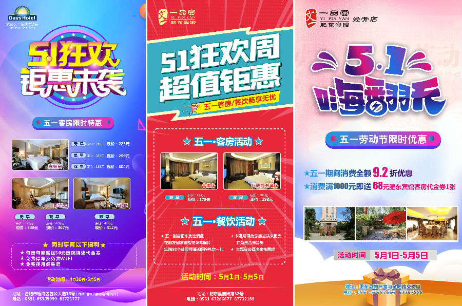 “五一”小长假期间,为让利顾客,各店都定制了促销活动,赠送、打折都不在话下。文一戴斯大饭店、一品宴铜陵路店、和平大酒店、肥东宾馆提前研发了时令新品。一品宴铜陵路店精心布置了主题宴,肥东宾馆经开店定制了新颖的套餐,肥东宾馆还专门邀请了卡通玩偶与小朋友进行节日互动等。