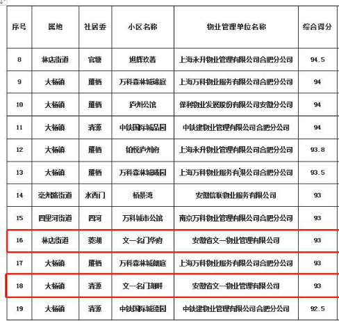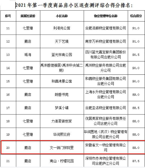 此外,在政务区文一·名门首府、庐阳区文一·锦门北韵、瑶海区文一·名门云河湾等小区在各区域测评中排名靠前,服务管理水平持续进步,业主满意度不断提升。