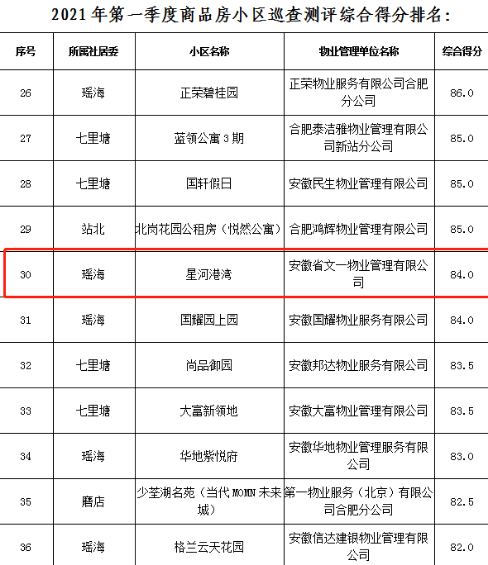 庐阳区对辖区内11个乡镇(街道、开发区)的65个村居所辖住宅小区的日常物业管理服务进行了巡查测评,共594个住宅小区纳入巡查范围,其中商品房小区167个(含2个公租房小区)。在167个商品房小区中,文一·名门华府位列第16名,名门湖畔位列第18名。