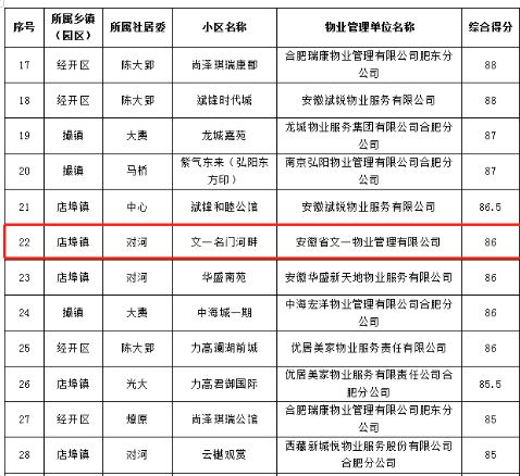 肥东县对全县110个小区(含1个公租房小区)的物业服务质量进行了综合测评,涵括商业开发、安置房、房改房等类型。其中文一·名门河畔位列榜单第22名。