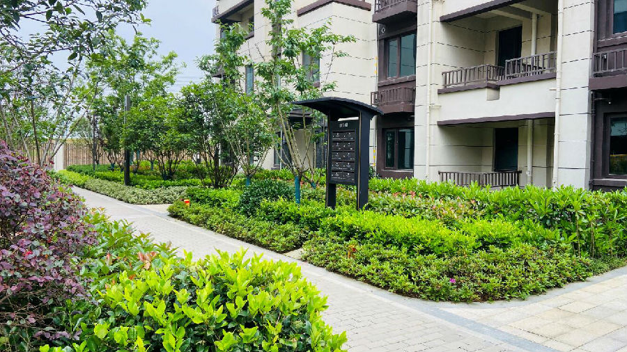 园区内部,楼栋错落有致,以纯正的新中式建筑风格与山居宜居元素相融合,整体外立面以米黄色、暗红色为基调,雄伟中不失轻盈,活泼中又不失大气,一砖一瓦体现品质。
