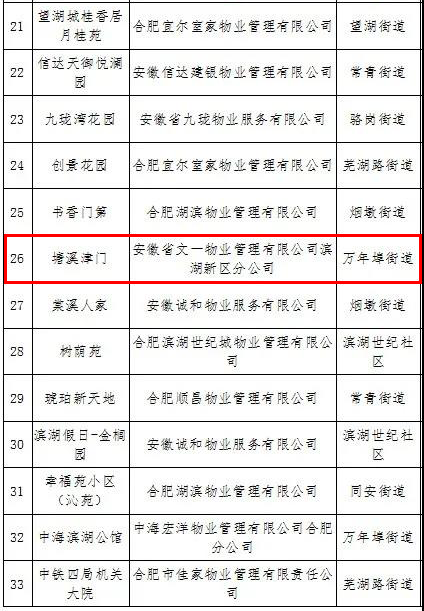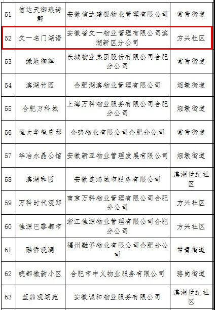 7月18日,2021年包河区第二季度住宅小区物业服务测评结果公布。文一滨江物业所辖多个小区跻身测评榜单前列,其中文一·塘溪津门物业跻身测评榜第26名,文一·豪门金地、名门湖语小区跻身排名前列,物业管理工作获得上级主管部门认可。