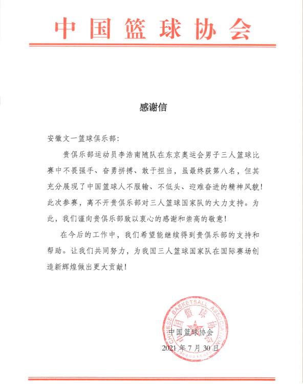 2021年夏天,三人篮球项目首次进入奥运会,入选中国三人篮球国家队的李浩南无形中也创造了历史。彼时,中国篮球协会特意致函,感谢文一男篮。奥运会结束后,李浩南以奥运联合队的名义参加陕西全运会并夺得冠军,帮助安徽体育代表团再添一枚金牌,正是多了这一枚金牌,从而创造了安徽体育代表团参加历届全运会以来的最好成绩。