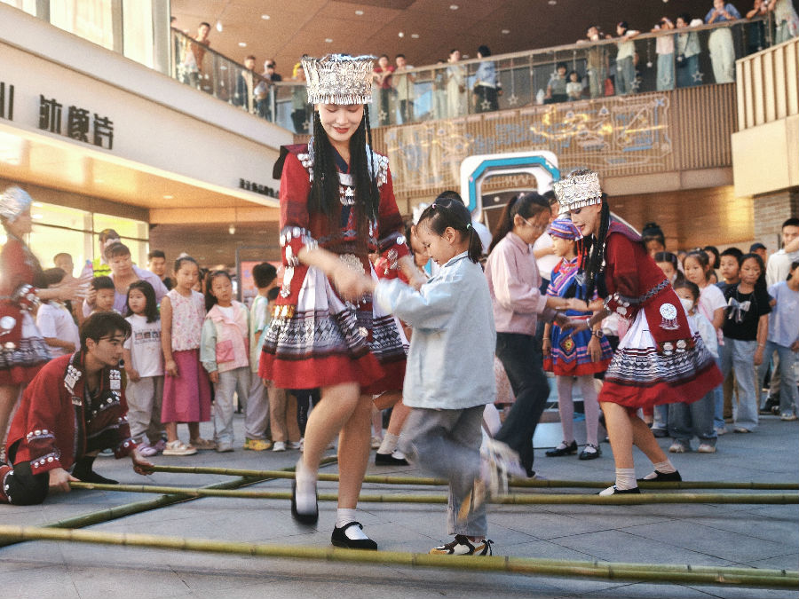 廊桥两岸,壮族对山歌的悠扬旋律刚刚落下,满堂喝彩余音未绝,清脆的竹竿敲击声便已响起,游客们在苗族竹竿舞的节奏中欢笑穿梭;转身间,彝族阿诗玛的舞裙如索玛花般绚烂绽放,将古老叙事融入翩跹舞步;而深沉雄浑的藏族藏戏唱腔仿佛携雪域之风震撼心灵,当人们仍沉浸在神话史诗中,高亢的蒙古族长调又掀翻屋顶,宛如万马奔腾将草原的辽阔之风直接吹入江南水乡——一幕接一幕的精彩,让八方游客真切感受到中华民族一家亲的炽热真情。