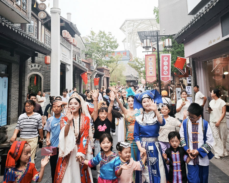 每日午后,喧天的音乐响彻水街,一场盛大的民族巡游热烈开启!身着各式艳丽民族服饰的队伍宛如流动的彩虹,一路欢歌,一路起舞,将整条街点燃成欢乐的海洋。游客们纷纷涌入巡游队伍两侧,孩子们兴奋地跟着节奏跳跃,年轻人举起手机记录这缤纷时刻,欢呼声、音乐声、欢笑声层层交织,水街化作一座没有围墙的民族团结盛宴,每个人都是这盛大节庆中最动人的风景。