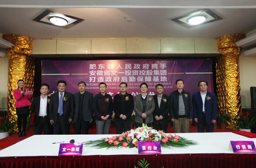 11月19日下午,肥东县政府携手文一集团打造政府后勤保障基地签约仪式在肥东宾馆三楼大会堂举行。肥东县常委常务副县长张红军、安徽省文一投资控股集团董事长周文育出席仪式并致辞,县行政管理局局长盛业波、文一集团工会主席餐饮旅游板块负责人周文锁分别代表合作双方在协议上签字。县委办公室主任张道德、县政府办公室主任杨文保、县人大办公室主任陈剑波、县政协秘书长米常胜、县行政机关事务管理局局长盛业波、县纪委、县政法委、县人武部、县组织部、县宣传部、县统战部的领导及文一集团党委书记、副董事长韦存华、集团副总裁兼安徽包河酒业有限公司董事长薛英姿和相关部门负责人见证了签约仪式。