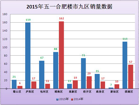 数据显示,2015年五一期间,合肥楼市九区销量突破100套的共有2个,分别是庐阳区的159套和滨湖区的113套;瑶海区、经开区、包河区、政务区、蜀山区、高新区、新站区紧随其后。